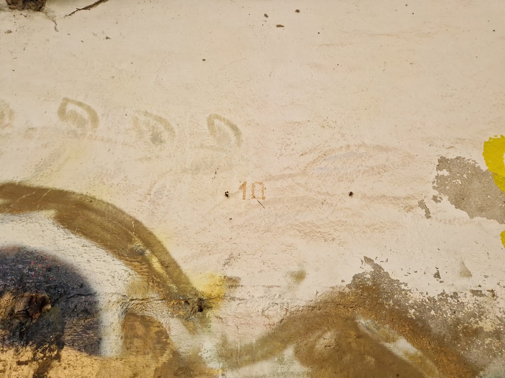 Vue intérieure de l'usine électrique du poste photo-électrique : peintures française (numérotation des hamacs de la batterie d'artillerie antiaérienne) et allemande (décor du réfectoire) (état en 2024)Immatriculation