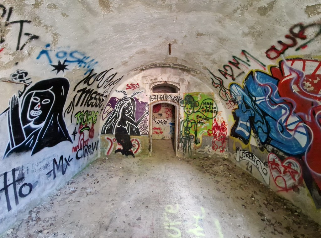 Vue de l'abri voûté de la batterie d'artillerie de 32 cm (état en 2024). Les murs sont régulièrement taguésImmatriculation