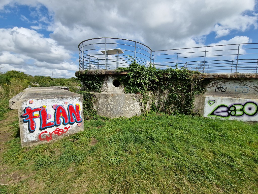Vue du poste de commandement de groupe d'artillerie avec son garde-corps en acier galvanisé (état en 2024). Juste devant, une niche à munitions de la batterie d'artillerie antiaérienne françaiseImmatriculation