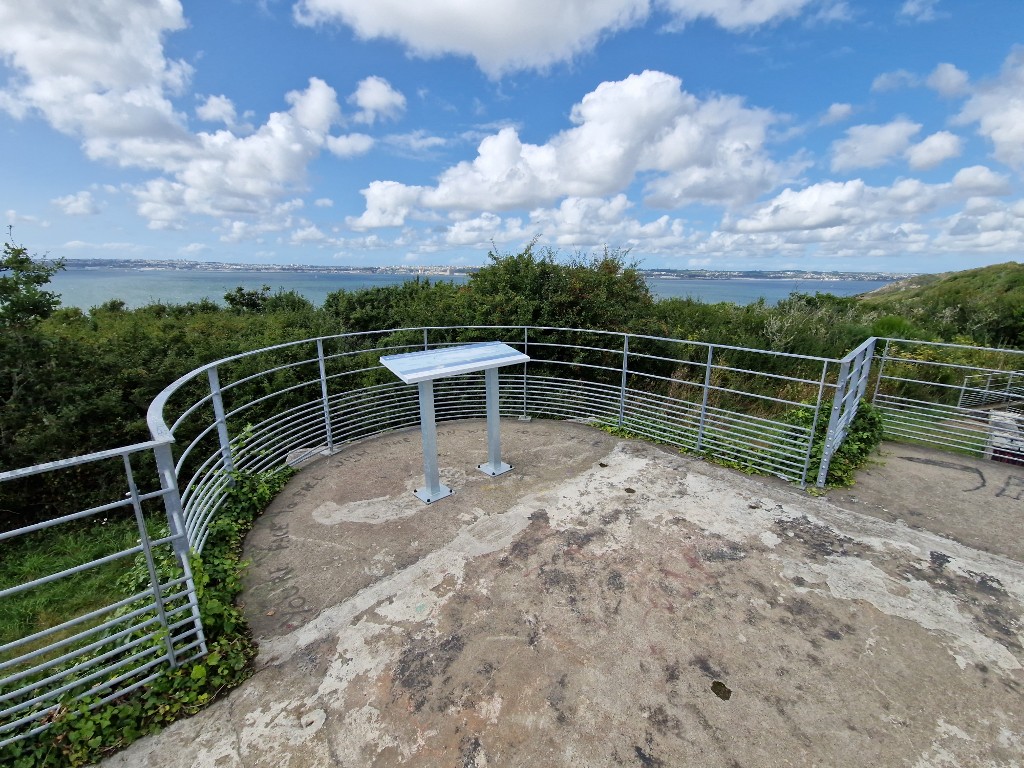 Vue du bélvédère aménagé sur la dalle de couverture du poste de commandement de groupe d'artillerie avec son garde-corps en acier galvanisé (état en 2024). La chambre de veille a été déconstruiteImmatriculation