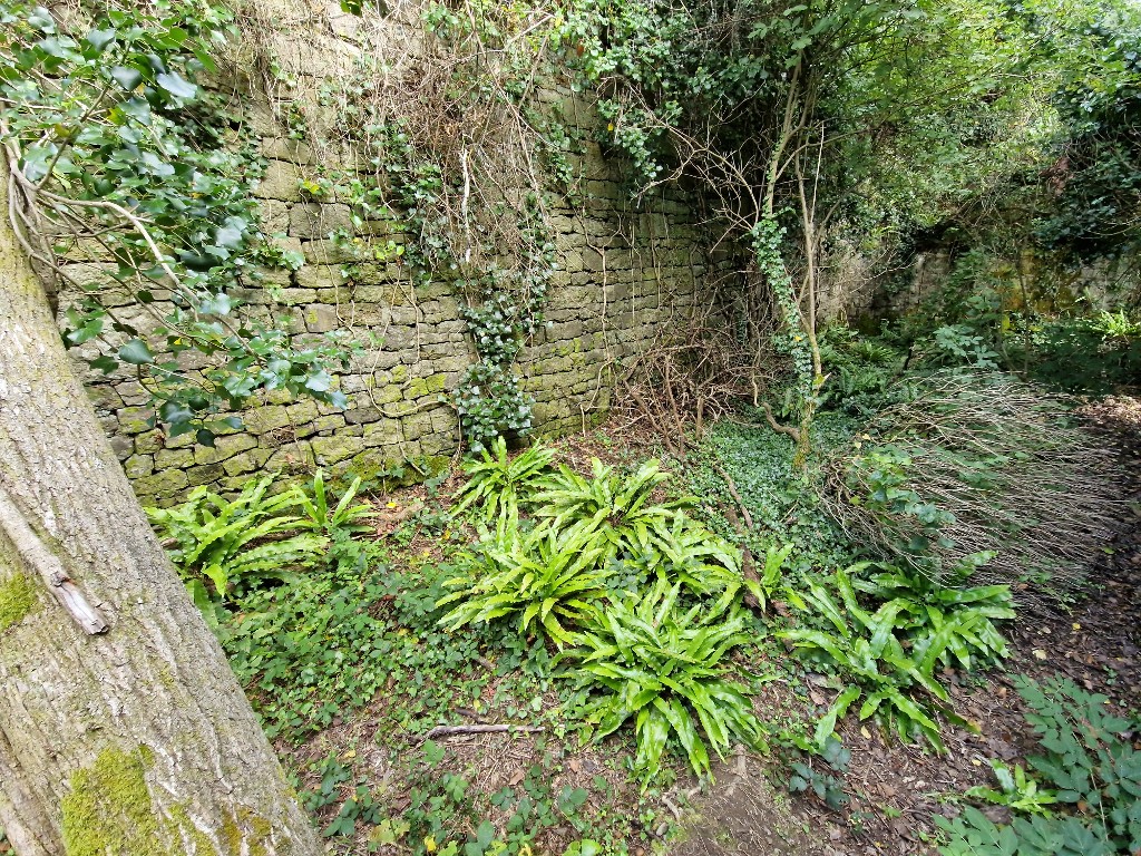 Vue du fossé sec de la redoute au nord-est (état en 2024). La contrescarpe est maçonnéeImmatriculation