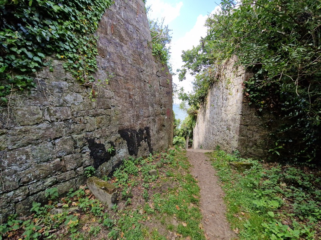 Vue de l'extrémité du fossé sec menant - via un escalier - à la batterie basse (état en 2024)Immatriculation