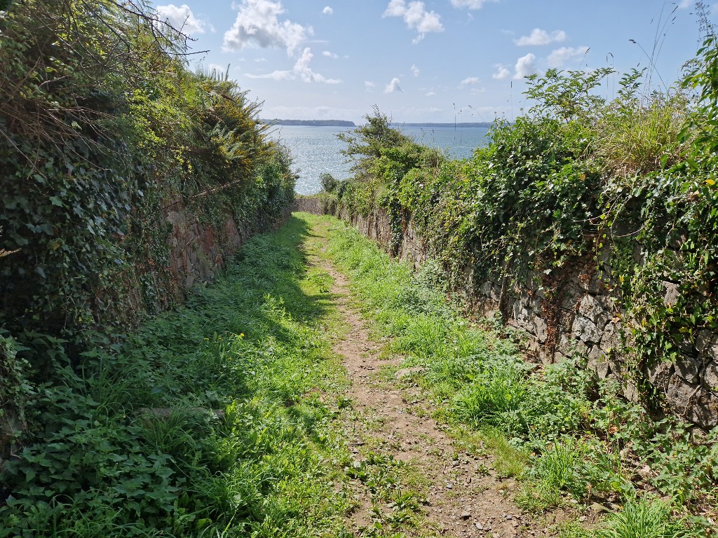 Vue du chemin reliant les parties haute et basse du fort (état en 2024). Il est bordé de murs de protection : à gauche, le mur est pour partie escarpé dans le rocherImmatriculation