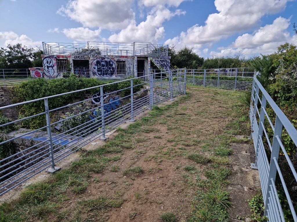 Vue des deux ponts d'accès à la redoute avec leurs garde-corps en acier galvanisé (état en 2024). En contrebas, la cour de la redoute à laquelle on accède par deux escaliersImmatriculation