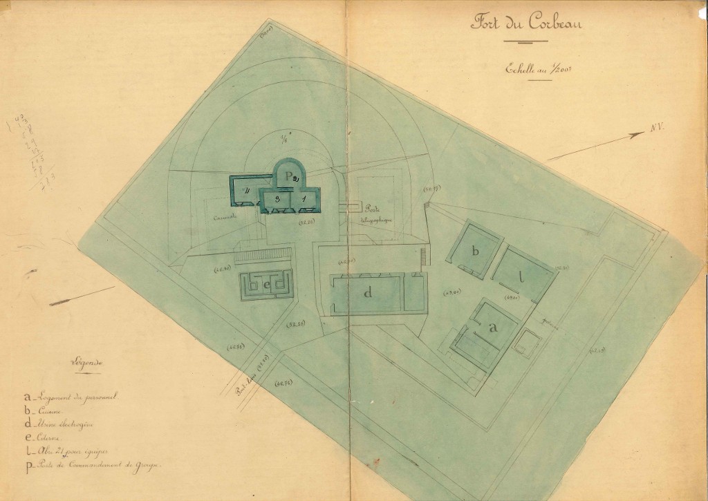 Plan de la partie haute du fort du Corbeau, vers 1910 (les bâtiments liés au poste photo-électrique apparaissent sur le plan)Immatriculation