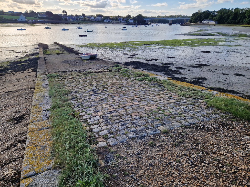Vue de la cale Saint-Yves dans la Penzé : elle était dallée à l'origine. Cette cale a servi à mettre à l'eau et remonter les hydravions avant la construction du slipwayImmatriculation