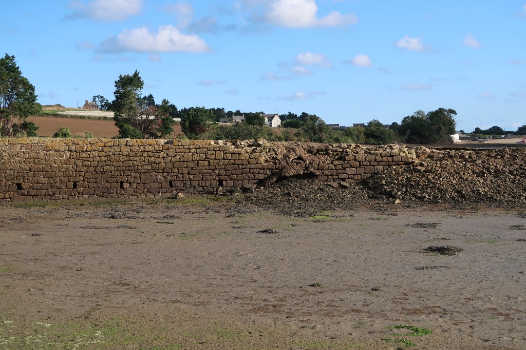 Vue de détail de l'élévation sud : maçonnerie de moellon de granite. Des portions de cale sont fortement dégradées par l'érosion marineImmatriculation
