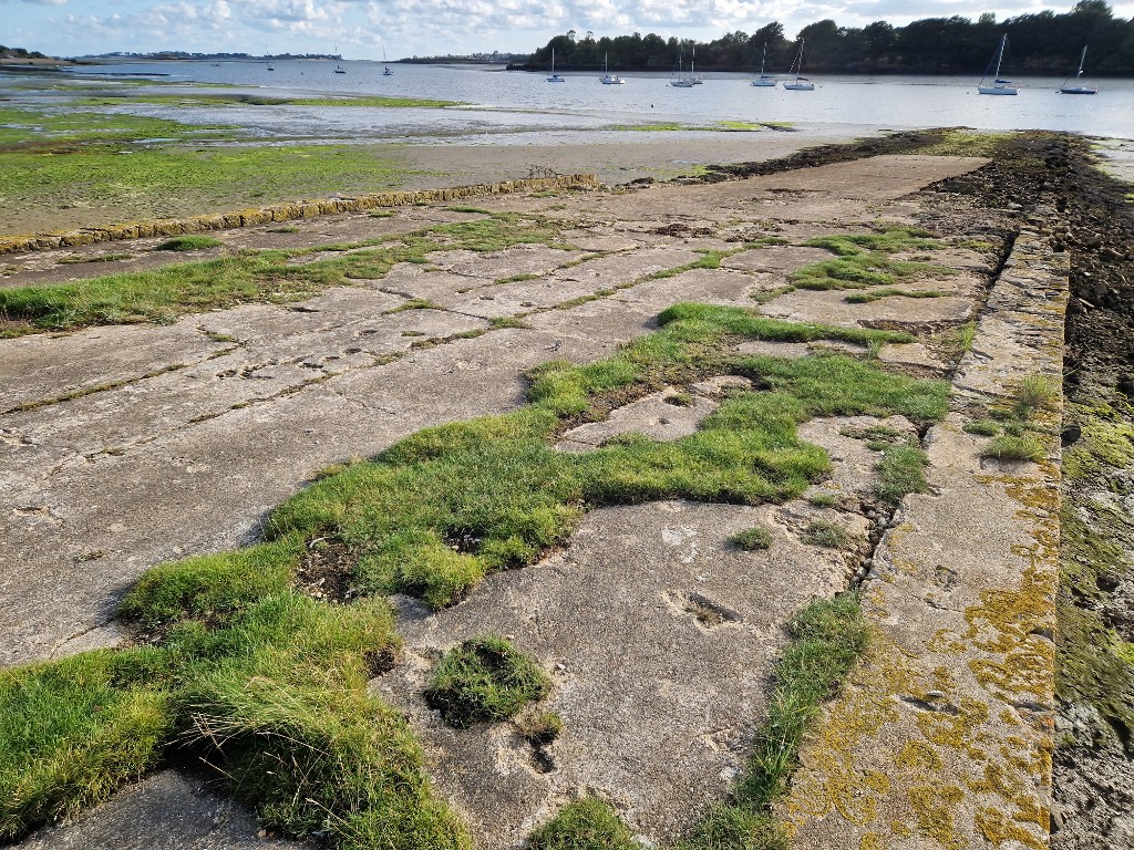 Vue générale du slipway vers la Penzé : dégradation et végétalisation spontanée de la partie supérieure en béton arméImmatriculation