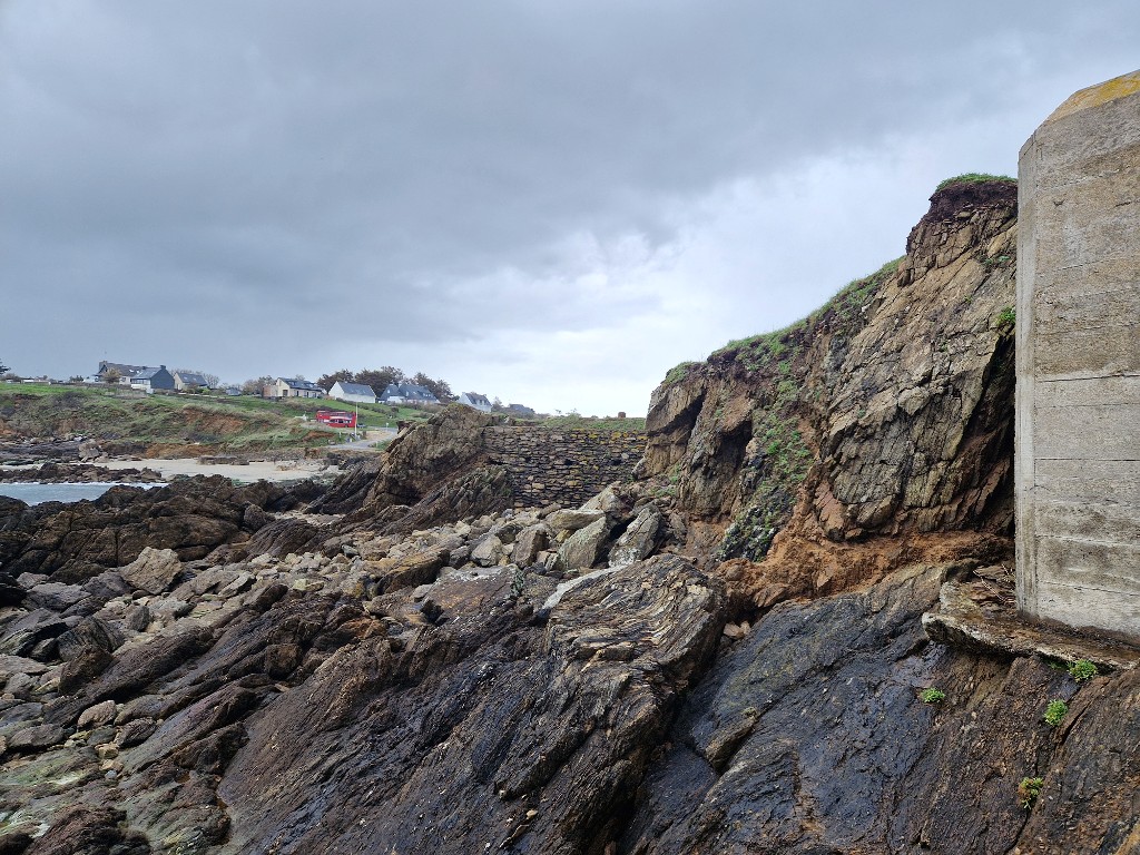 Vue de situation. Du côté ouest de l'îlot, l'érosion marine est forte. En arrière-plan, le mur en maçonnerie de moellon cache le bunker - abriImmatriculation