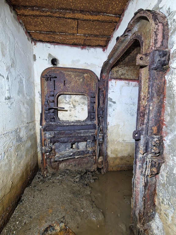 Vue intérieure : petite salle du périscope, porte blindée à deux vantauxImmatriculation