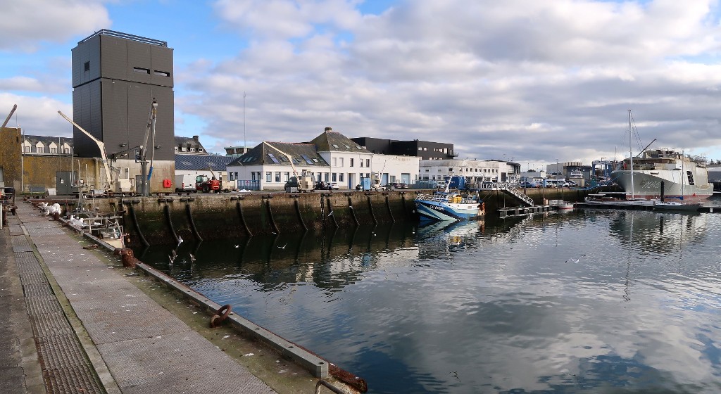 Quai Est : tour à glace et bateaux de pêche accostés à proximité du ponton de Concept Mer et des chantiers PiriouImmatriculation