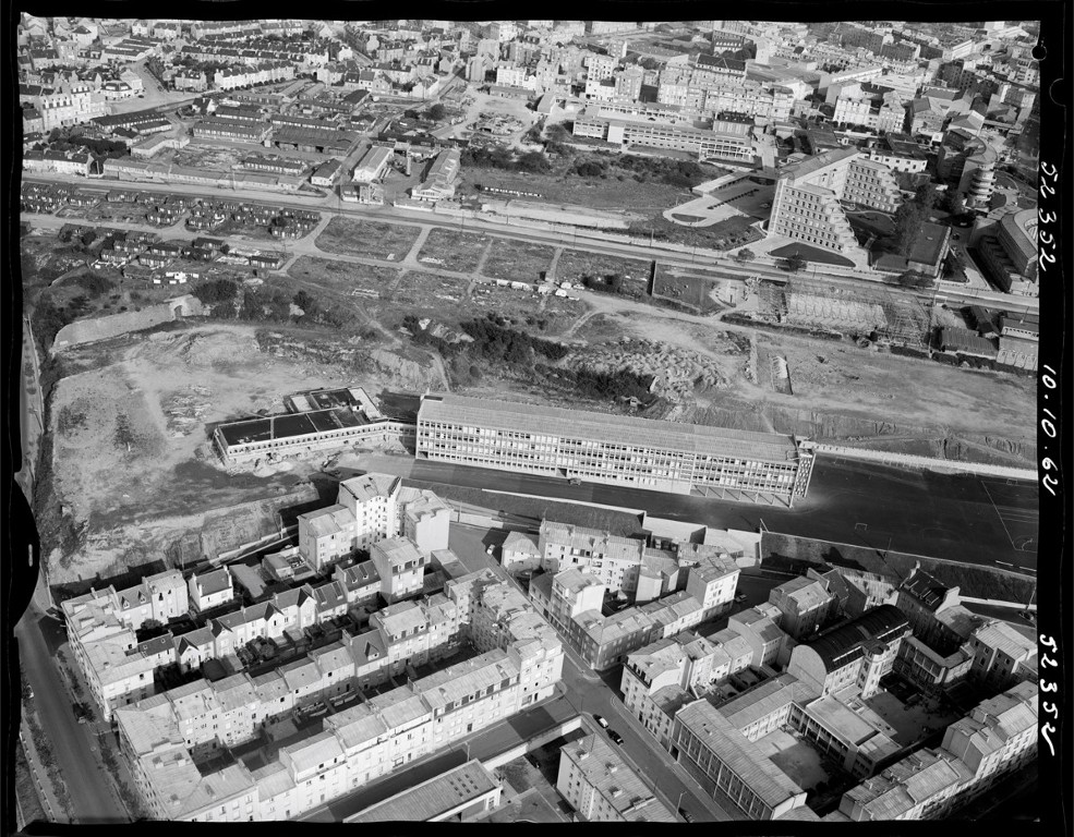 Georges Tourry, architecte. Vue aérienne prise de l'ouest, le 10 octobre 1962. Le gymnase est en cours de construction.Immatriculation