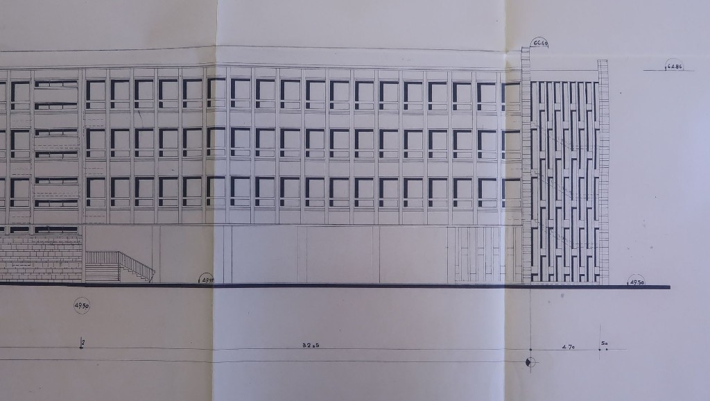 Elévation de la façade ouest. Georges Tourry et Hervé Péron, architectes, 1960.Immatriculation