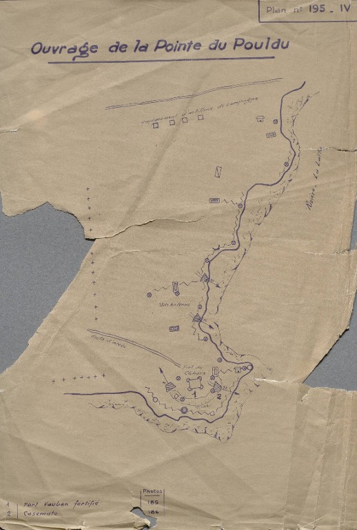 Plan des fortifications de la Pointe du Pouldu à Clohars-Carnoët, extrait du rapport Pinczon du Sel sur les installations du Mur de l'Atlantique, 1946-1949Immatriculation