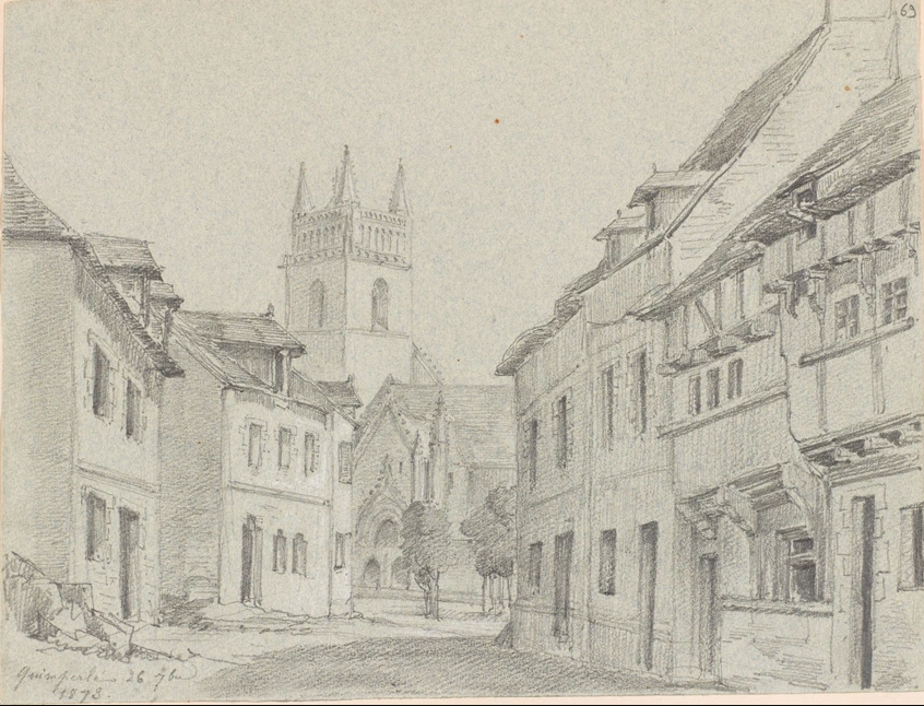 Quimperlé, vue de maisons et d'église, dessin de Louis Boitte (1830-1906), 1873. F 3457 C 1968