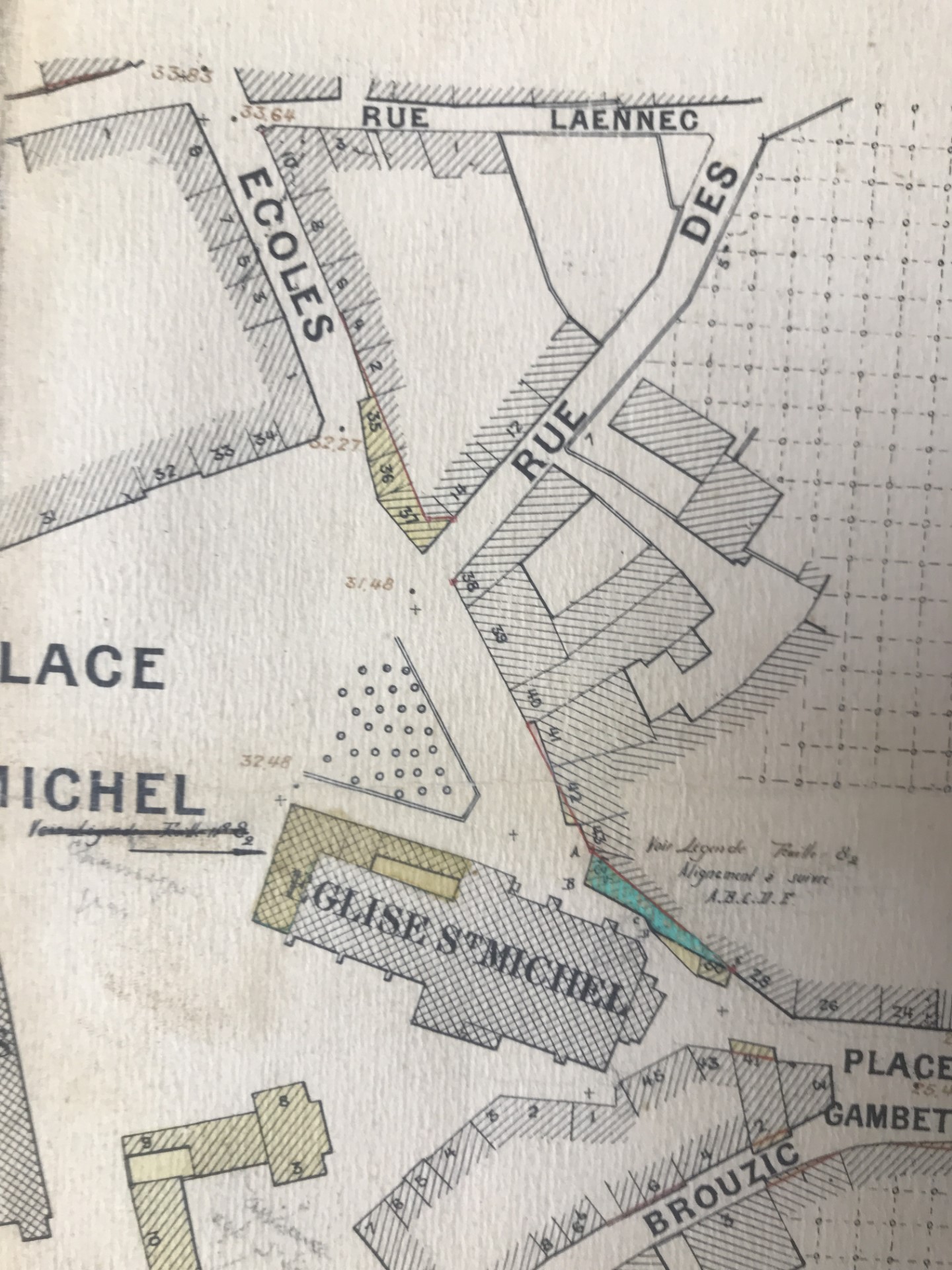 Extrait du plan d'aménagement de Quimperlé (1928): les façades "à conserver" (en vert) et celles "à retrancher" (en jaune), place Saint-MichelImmatriculation