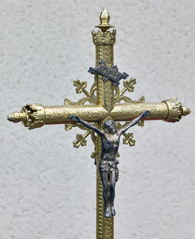 Croix de procession du sanctuaire de la Peinière, avec le Christ en croix.Immatriculation