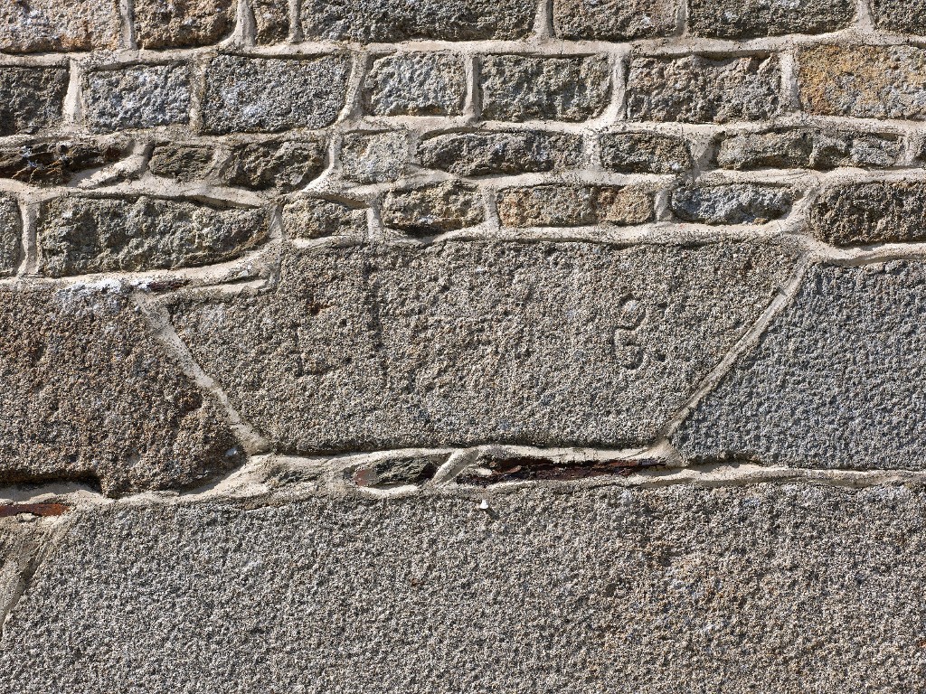 Façade antérieure, détail du linteau de la porte d'entrée avec armoiries bûchées.Immatriculation