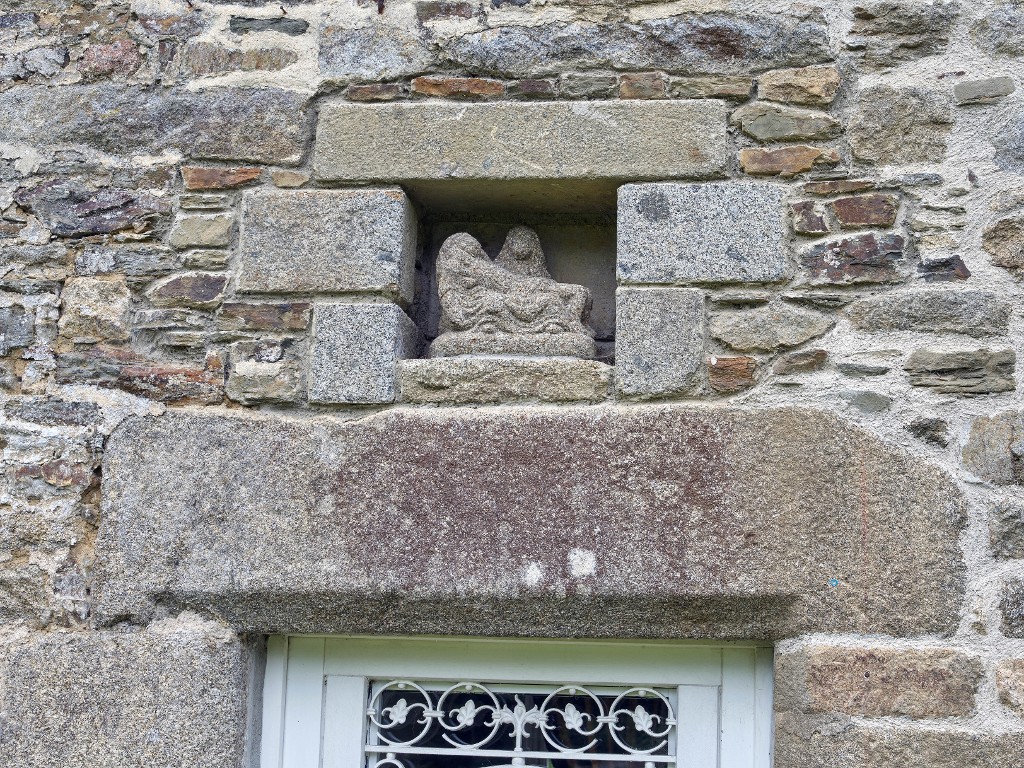 Façade postérieure, détail d'un linteau surmonté d'une niche abritant une piéta en granite.Immatriculation