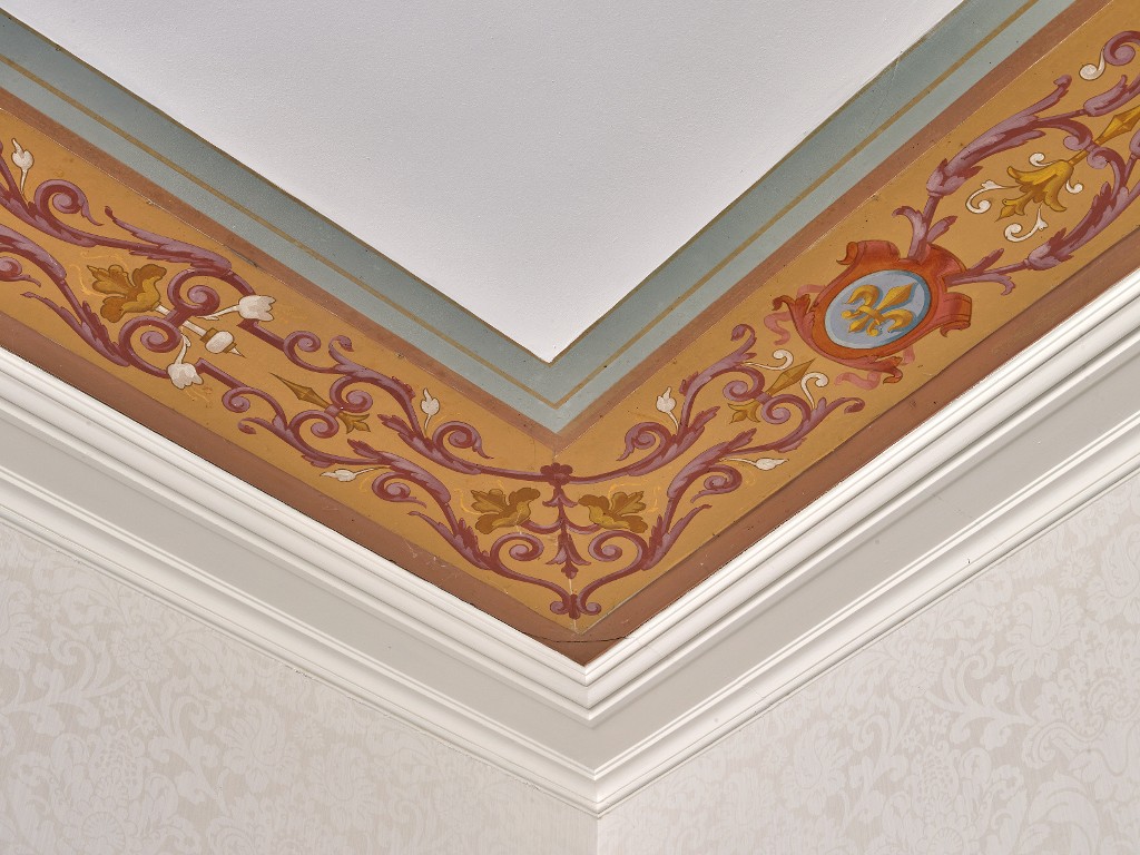 Chambre du rez-de-chaussée. Détail du décor peint du plafond.Immatriculation