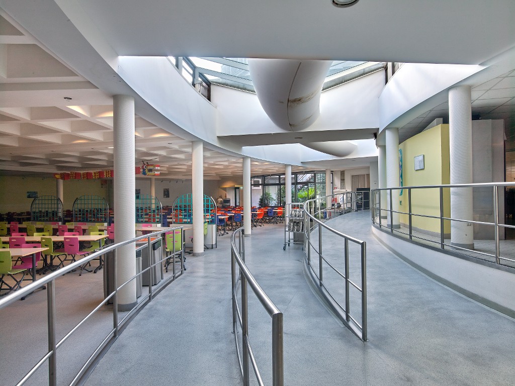 Vue intérieure du restaurant scolaire : la file d'attente. J. Y. Gautier, architecte.Immatriculation