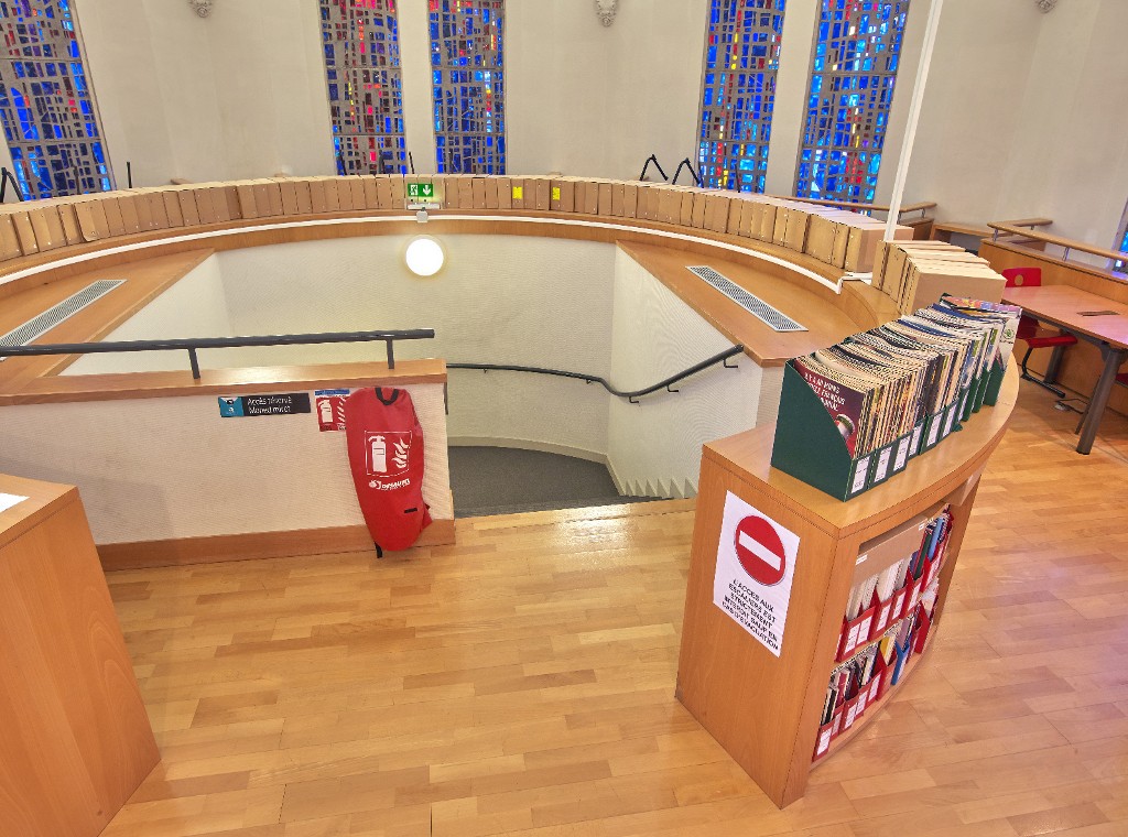 Escalier de secours du CDI, adoptant la forme de l'absyde de la chapelle. J. Y. Gautier, architecte.Immatriculation