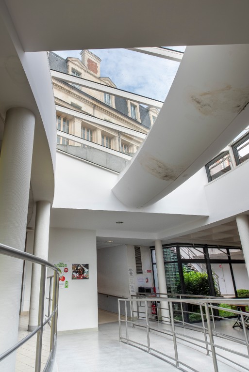 Une des verrières du restaurant scolaire (J. Y. Gautier, architecte). Noter l'ouverture du regard vers les façades 19e siècle.Immatriculation