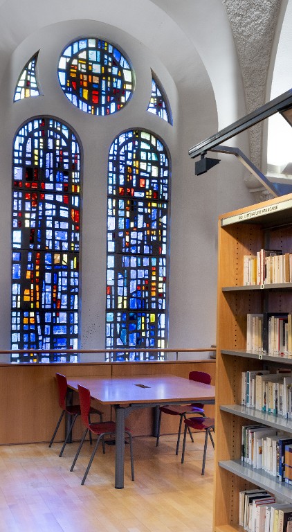 Vitraux de Gabriel Loire (1964), vus du CDI. Noter l'aménagement pour que le plancher ne les divise pas en deux. Restructuration Joël Y. Gautier, architecte.Immatriculation