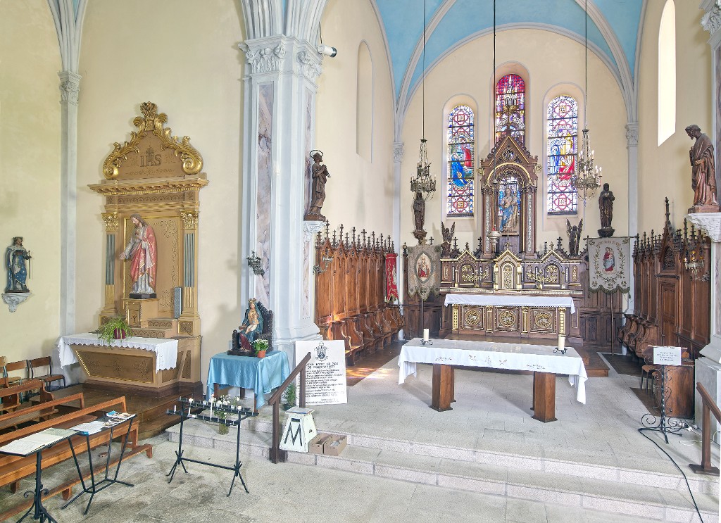 Vue du chur. Les deux statues de Notre-Dame du Roc sont exposées dans le choeur de l'église. L'une est placée sur le maître-autel tandis que l'autre, datant de 1937, se trouve plus proche de ceux venant l'honorer ou la prier.Immatriculation