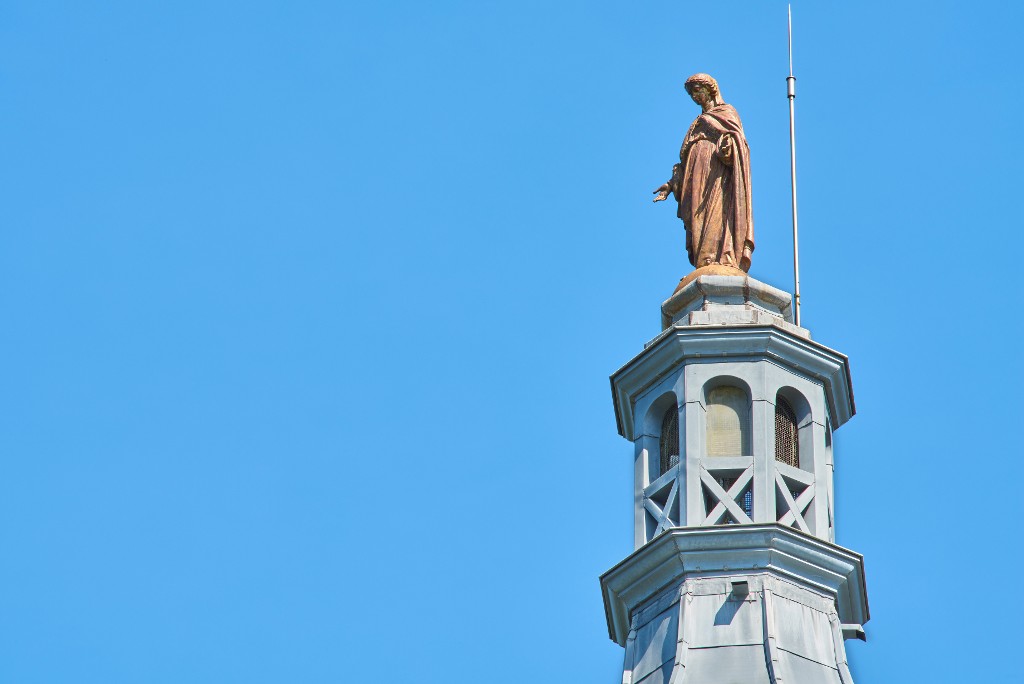 Vue générale de la statue offerte en ex-voto par le comte et la comtesse de Courte à la naissance de leur enfant. La statue se trouve au sommet du dôme du clocher de l'égliseImmatriculation