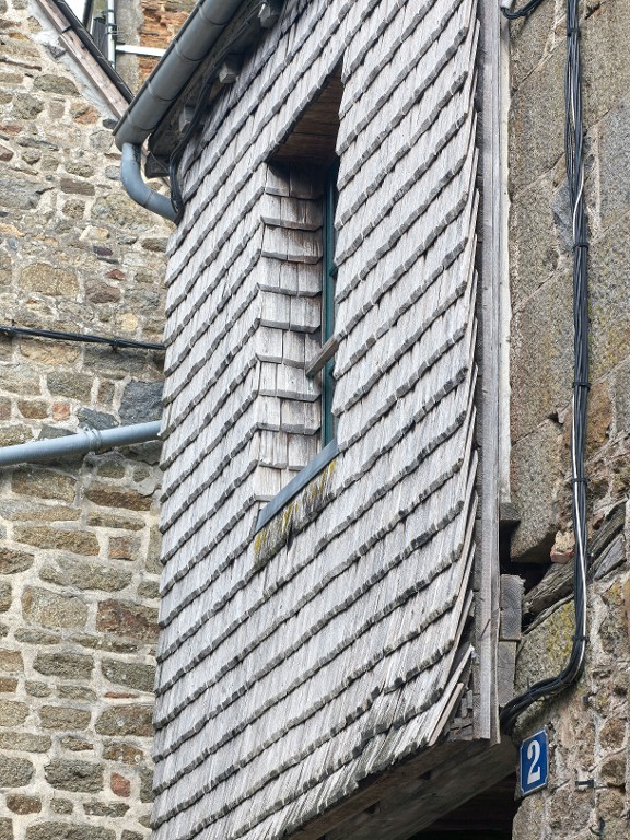 Essentage de bardeaux sur le pan de bois du porche, côté rue.Immatriculation
