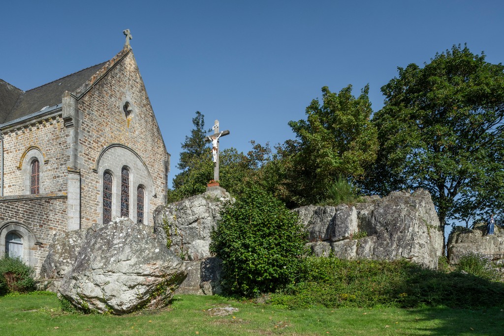 Vue du chur de l'édifice (façade est) depuis le sud-est. Un calvaire est placé au sommet des rochersImmatriculation