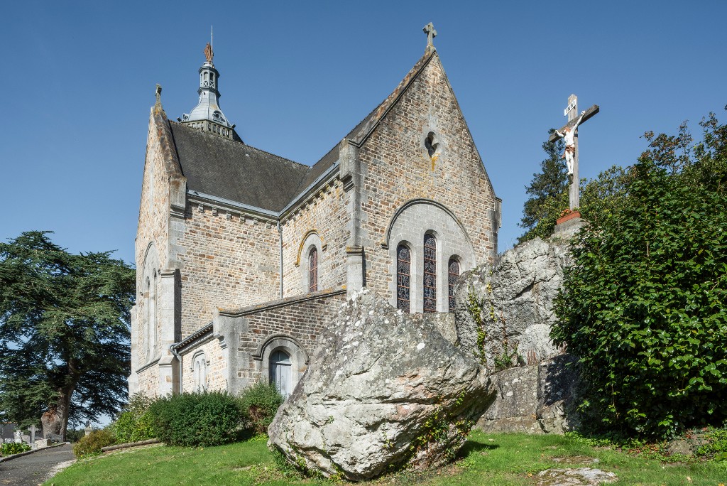 Vue d'ensemble de la face sud-est de l'édifice avec la chapelle sud, la sacristie et le chur. Le calvaire se trouve au sommet des rochersImmatriculation
