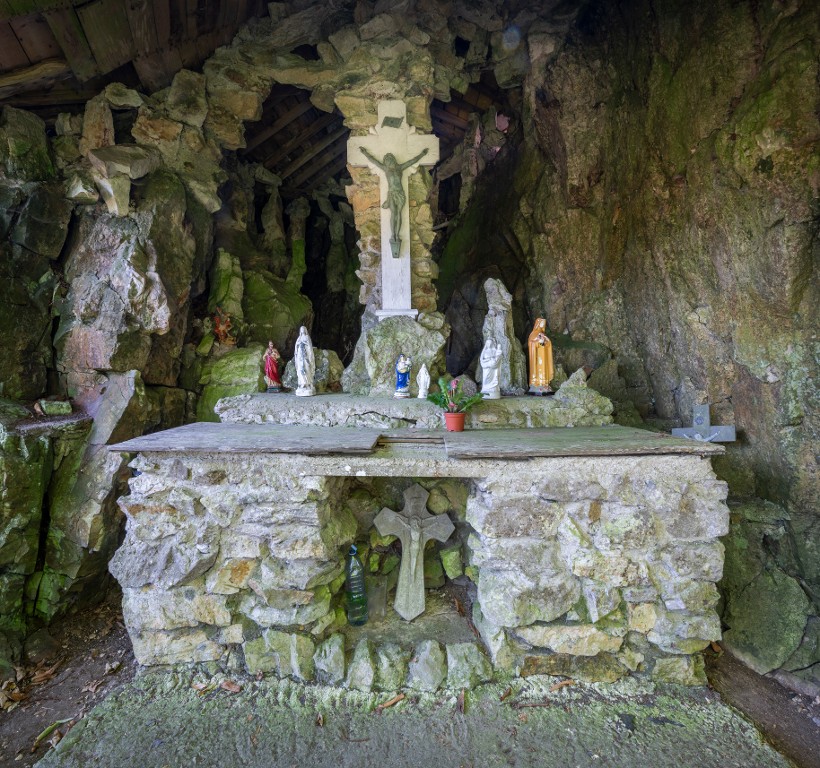 Vue générale de la grotte de Notre-Dame de Lourdes, située en contrebas de l'égliseImmatriculation