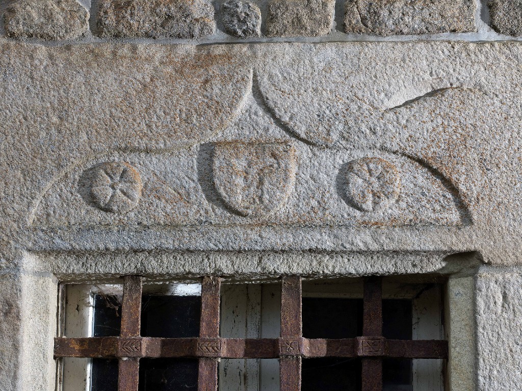Façade est. Fenêtre de la chambre basse. Détail du linteau orné d'un blason et deux fleurs sous une accoladeImmatriculation