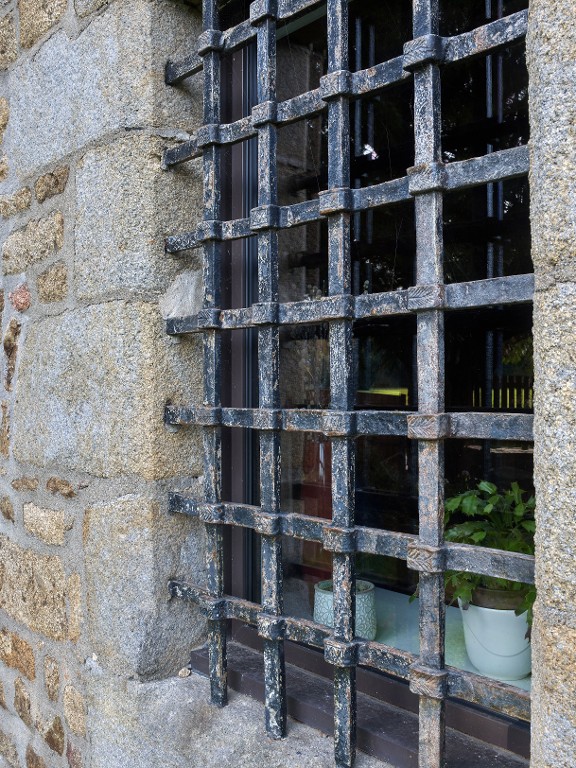 Façade sud. Fenêtre de la salle basse. Détail de la grille en fer forgé à décor gravé de feuille de fougère et de croisillonImmatriculation
