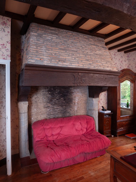 Chambre ou salle haute. Cheminée à jambages en granite, consoles et linteau en bois, contrecoeur et hotte en briqueImmatriculation