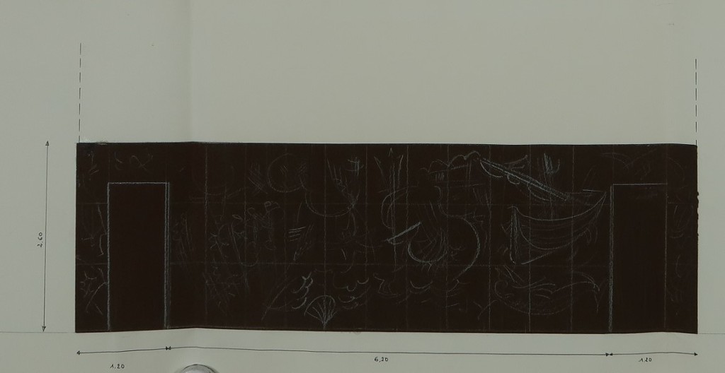 Séraphin Gilly, panneau de boiserie gravée : maquette. Vers 1964.Immatriculation