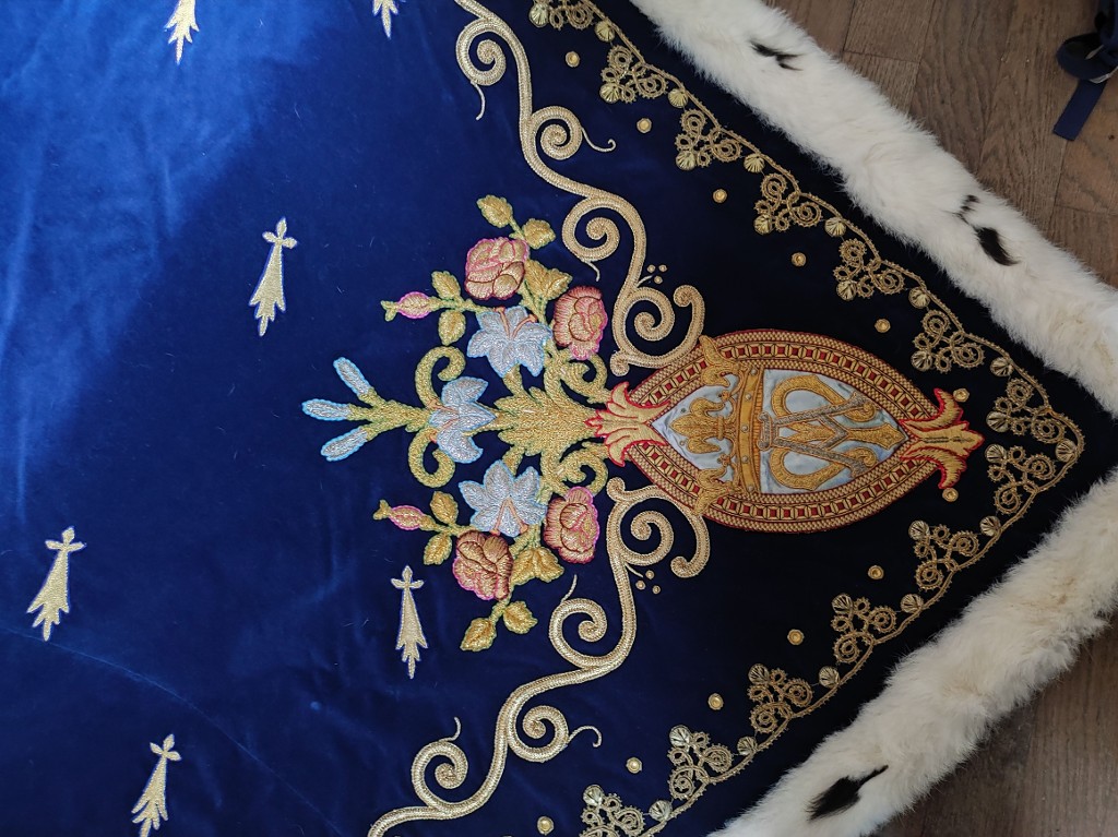 Détail des broderies sur l'un des coins du manteauImmatriculation