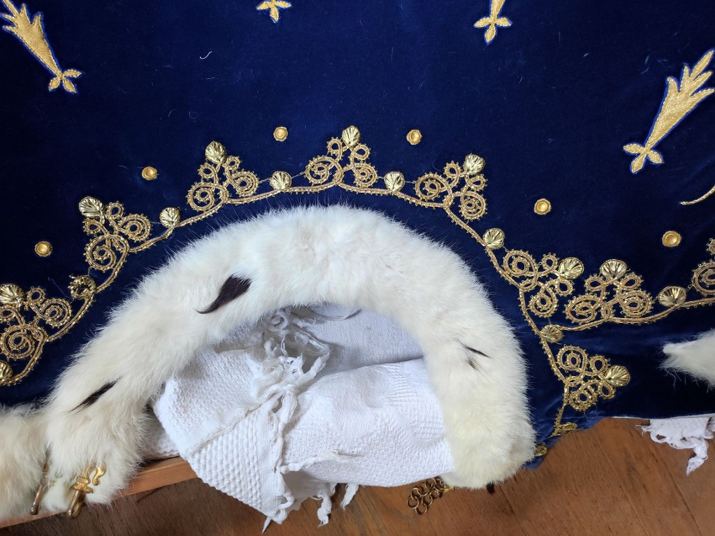 Vue de détail : col du manteau avec décors en fil métalliques dorés et bordure en (fausse ?) fourrure d'hermineImmatriculation