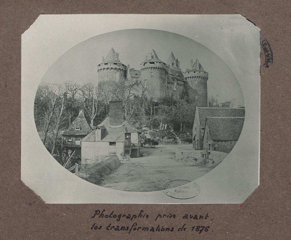 Vue sur le château avec au premier plan à gauche, deux maisons en pan de bois (fin 19e siècle)Immatriculation