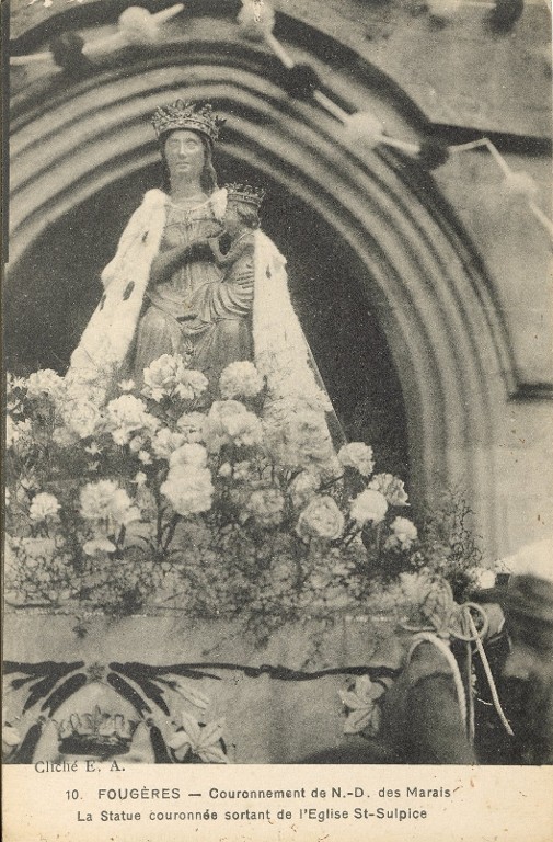 Vierge allaitante dite Notre-Dame des Marais, devant le porche de Saint-Sulpice, sur son brancard de procession, couronnée, portant son manteau de fêteImmatriculation