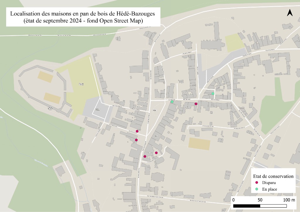 Localisation des maisons en pan de bois de Hédé-Bazouges (état des connaissances de septembre 2024).Immatriculation