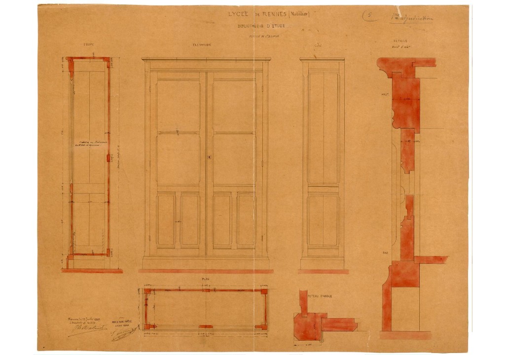 Paln, coupe et élévations des armoires de la bibliothèque d'étude. J-B. Martenot, architecte, 1887.Immatriculation