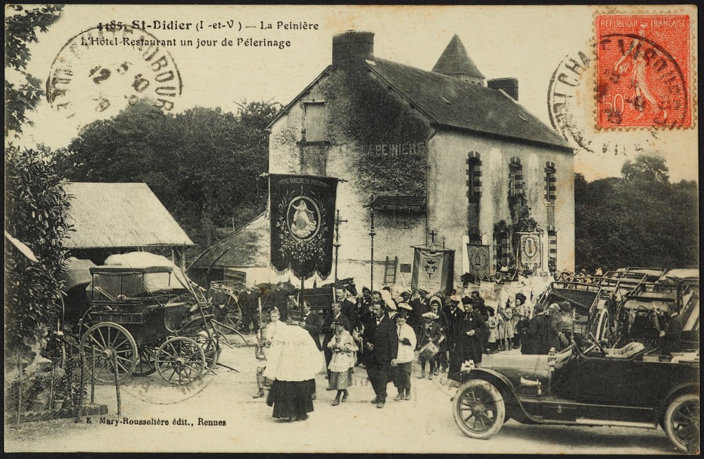 Carte postale représentant une procession au lieu-dit la Peinière en 1909 : "L'Hôtel-Restaurant un jour de Pèlerinage" ed. E Mary-Rousselière, RennesImmatriculation