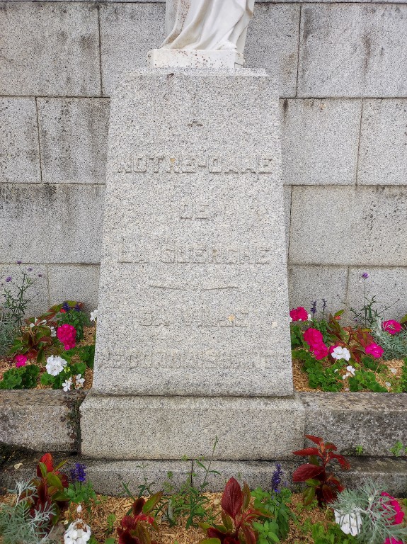 Détail du socle de la statue comportant l'inscription "Notre-Dame de La Guerche - Sa ville reconnaissante"Immatriculation
