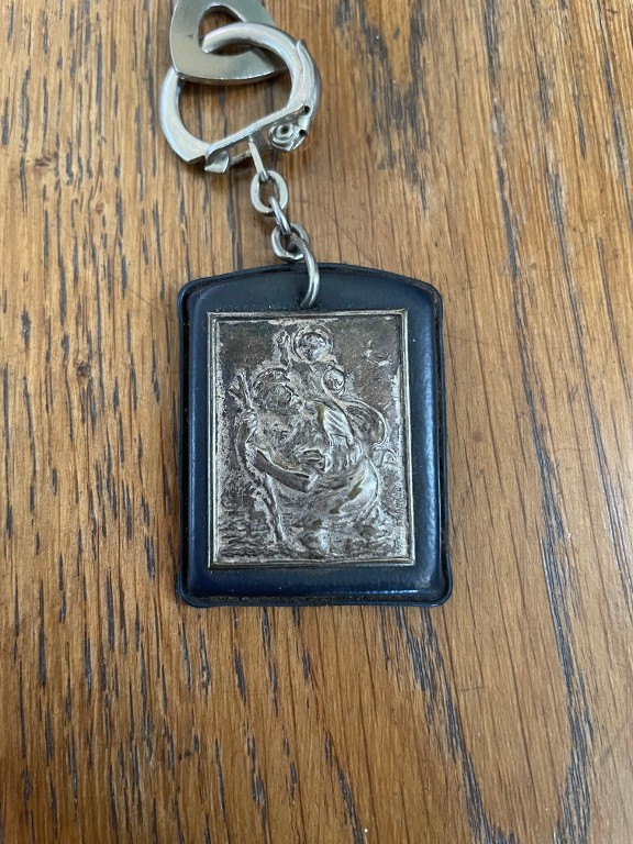 Porte-clé représentant saint Christophe lors de la traversée du fleuve. La lune dans le coin supérieur droit rappelle que cette scène se passe la nuitImmatriculation