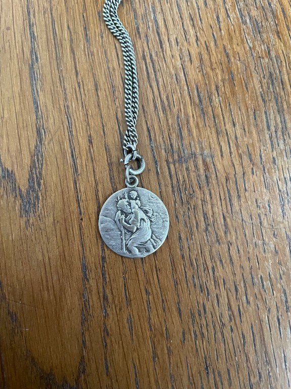 Vue de la face principale de la médaille représentant saint Christophe portant l'Enfant Jésus lors de sa traversée du fleuveImmatriculation