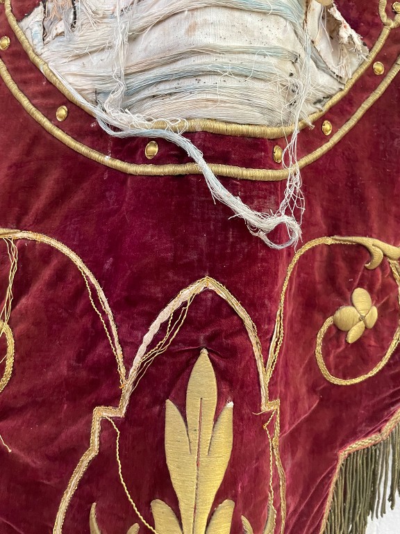 Vue de détail sur les broderies au bas de la bannière : décors en fils métalliques et détail de la figure centraleImmatriculation