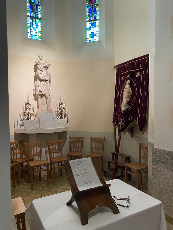 Vue de la statue dans son environnement. Sur le côté, la bannière de procession de saint Christophe est adossée au mur de la chapelleImmatriculation